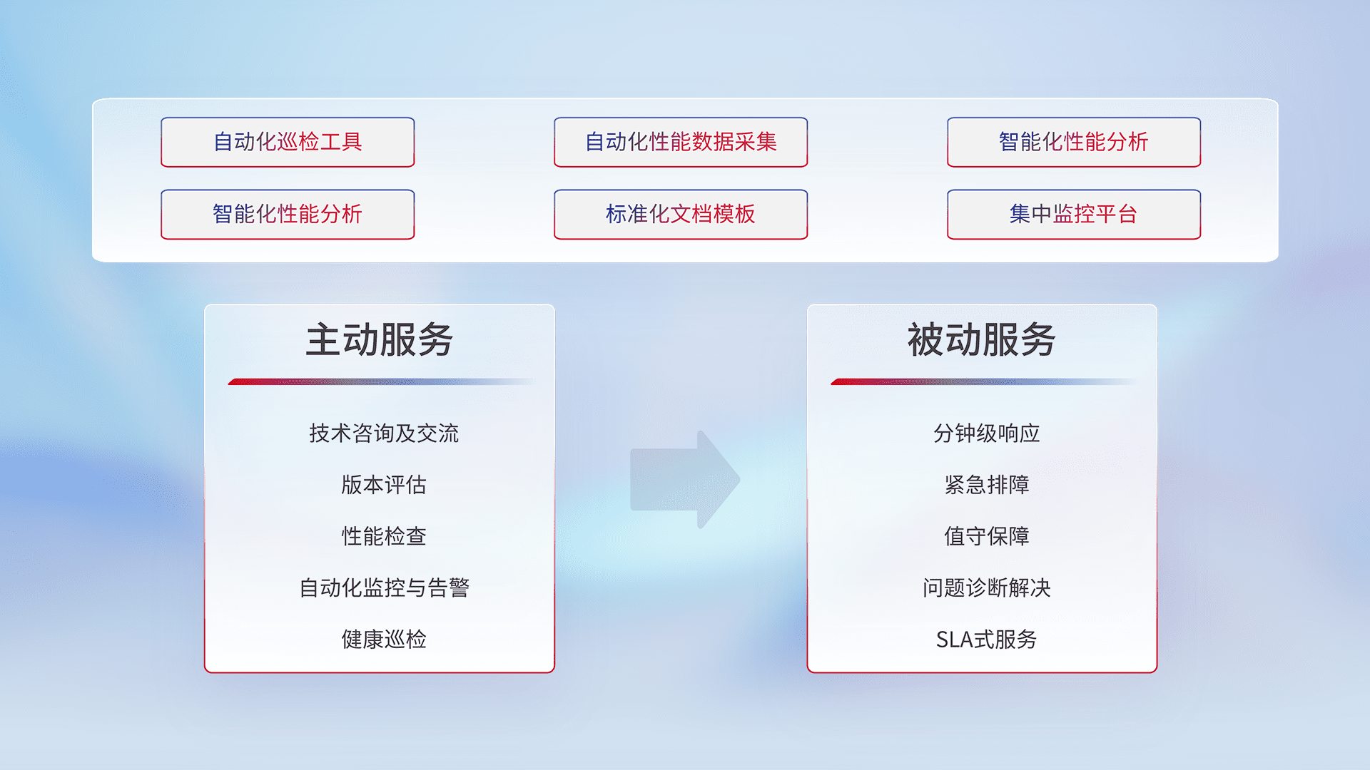 智能化工具和标准化文档,,保障服务质量,,提供主动服务(包含技术咨询、、版本评估、、、性能检查、、自动化监控与告警、、、健康巡检)和被动服务包含(分钟级响应、、紧急排障、、、、值守保障、、、、问题诊断解决、、SLA服务)。。